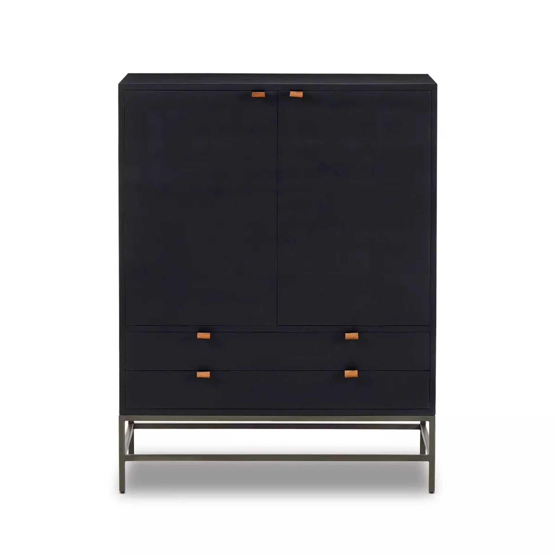 Inspiré du design épuré du milieu du siècle, ce meuble bar élégant en peuplier noir offre un vaste espace de rangement grâce à ses étagères spacieuses, son rangement pour verres et ses deux tiroirs. Les poignées en cuir à fixation métallique ajoutent une touche de texture surprenante.